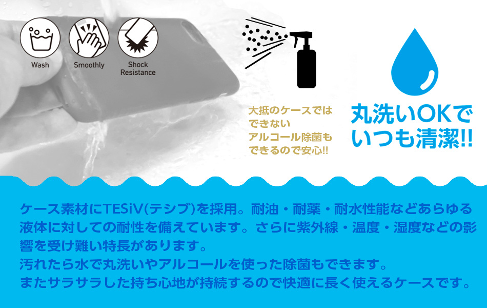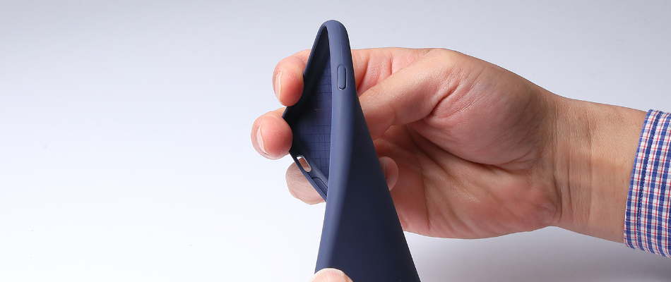 ケースの表面はサラサラとした感触で、防汚コーティングを施したシリコーンに似た感触になっています。TESiVは素材レベルで耐汚性に優れており傷が付きにくく、人体へのアレルギー反応が少ない優しい素材です(※1)。似た感触のシリコーンケースと比較して芯材とコーティングが不要なため、薄く軽量に成型できます。また、形状で似ているポリカーボネート製のハードケースよりも柔らかく、適切な硬度なのため、スマートフォンに装着した感触も心地よく仕上げられています。