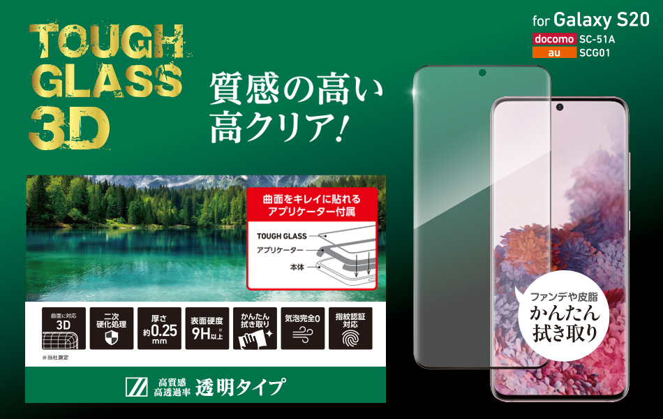Galaxy S20用。ディスプレイ内の指紋認証にも対応。ヒビが入りにくい独自開発の二次硬化ガラス「TOUGH GLASS 3D」