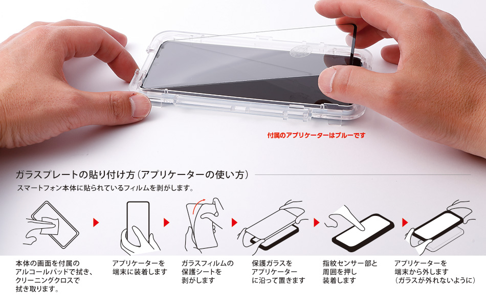 さらに、ディスプレイ内に搭載した超音波指紋センサーに対応すべく、センサー部分のみ特殊なノリを使用することで装着しても登録した指で画面に触れるだけでロック解除することが可能です。付属する専用アプリケーターを使えば、指紋センサー位置に対して簡単に正しく装着することもできます。