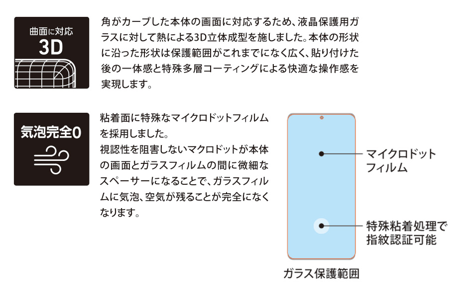本製品は、Galaxy S20の特徴でもある側面にまで広がるディスプレイをカバーするために3D立体成型済みです。また、特殊なマイクロドットフィルムを採用。視認できないほどのマイクロドットが微細なスペーサーになり、ディスプレイとガラスの間に空気が残らず、誰でもきれいに装着することができます。