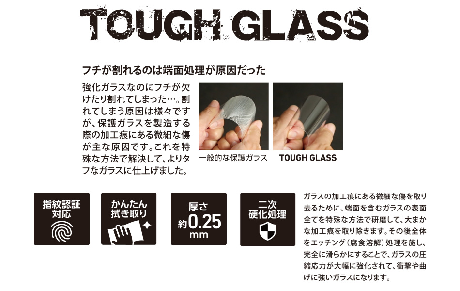 丈夫で長く使えることで定評のある「TOUGH GLASS 3D」は、独自開発した二次硬化ガラスを使用したディスプレイ保護ガラスプレートのシリーズです。一般的にガラスは、熱を加えてから急激に冷やす硬化処理法で強度を高めていますが、この方法では側面・端面まで十分に強化できず、金属などで衝撃が加わると「欠け」が生じてしまいやすいという特徴があります。しかも、この「欠け」は、一定の深さにまで達することで、ガラス自体が割れてしまう原因にもなっています。