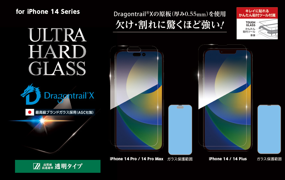 ディーフ株式会社(社長:荒木 徹、本社:東京都港区)は、Apple社製最新スマートフォン、iPhone 14シリーズ用のディスプレイ保護ガラスプレート「TOUGH GLASS」、国産「Dragontrail X」の原板をそのまま使った超耐久保護ガラス「ULTRA HARD GLASS」、スタンダードな「High Grade Glass Screen Protector」を2022年9月16日に発売いたします。
