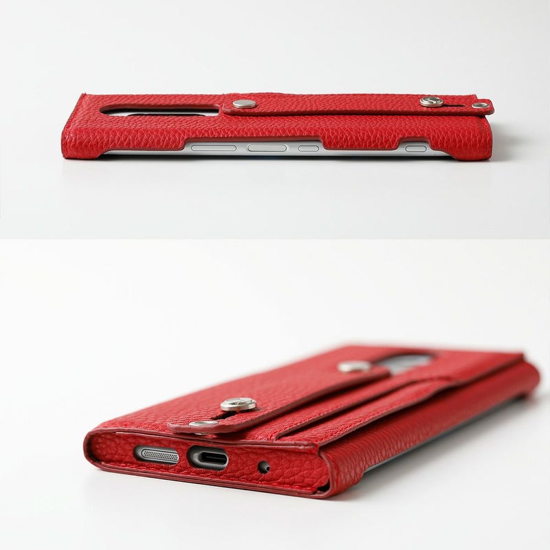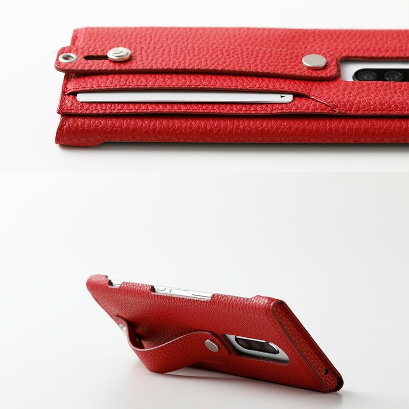 指を入れ、しっかりと本体を持つことができるようになるベルト付。縦長のXperia 1のボディをいつでも安心して使うことができます。このベルトは固めなので、さらに引き出せばスマホを横置きした際のスタンドにもなります。