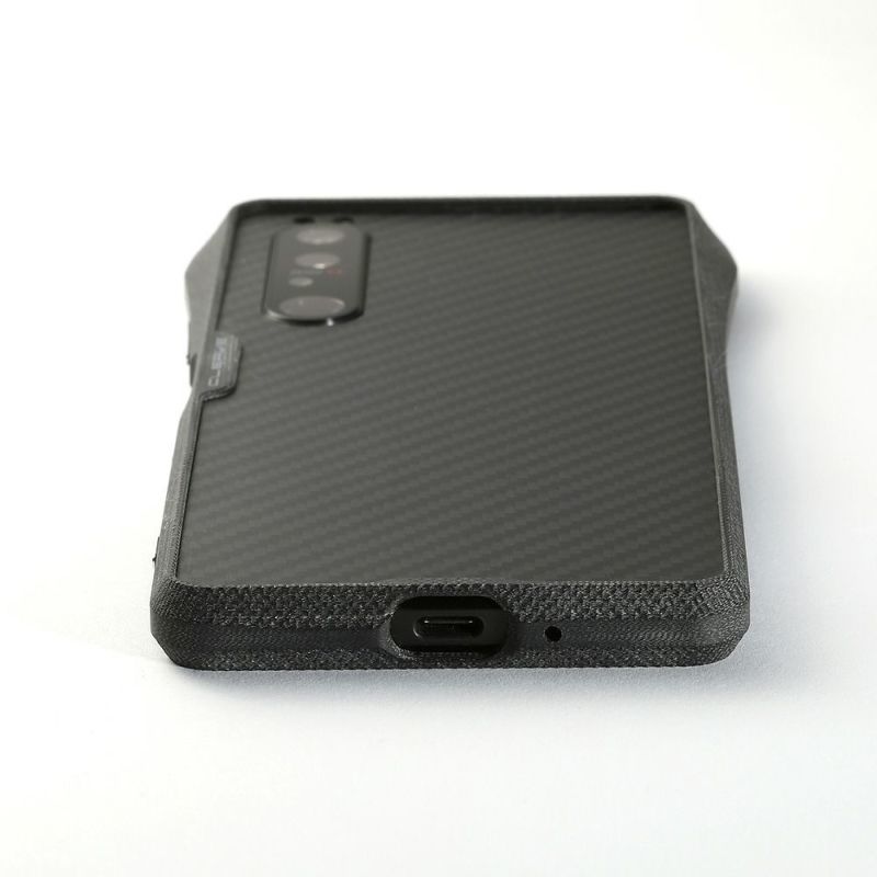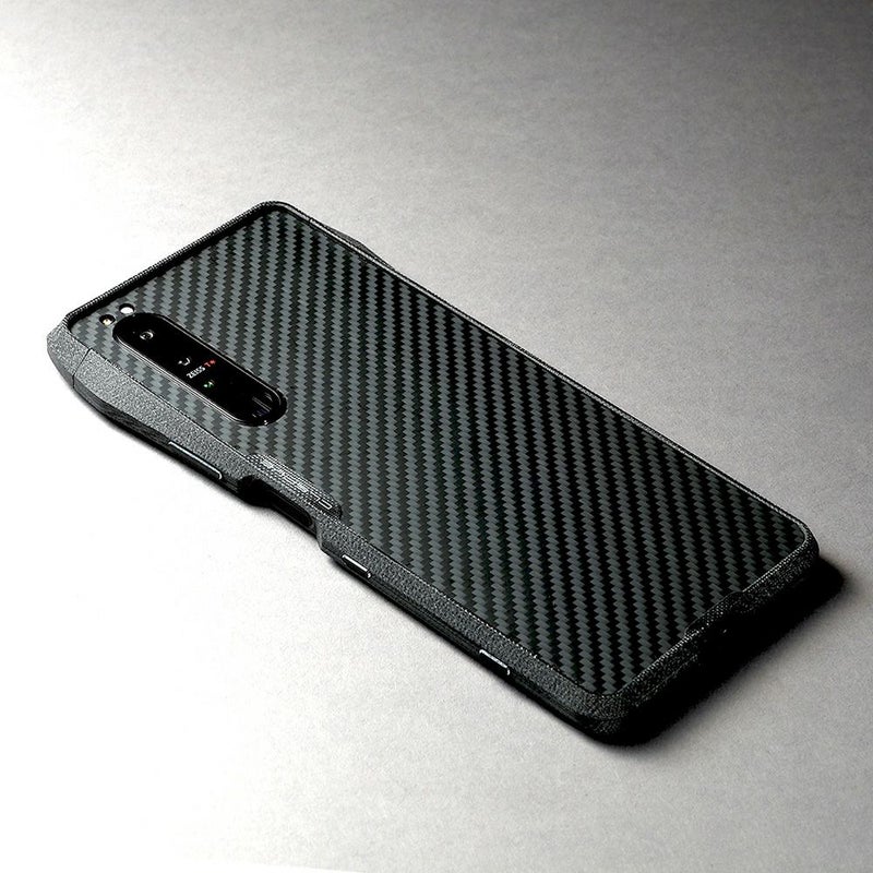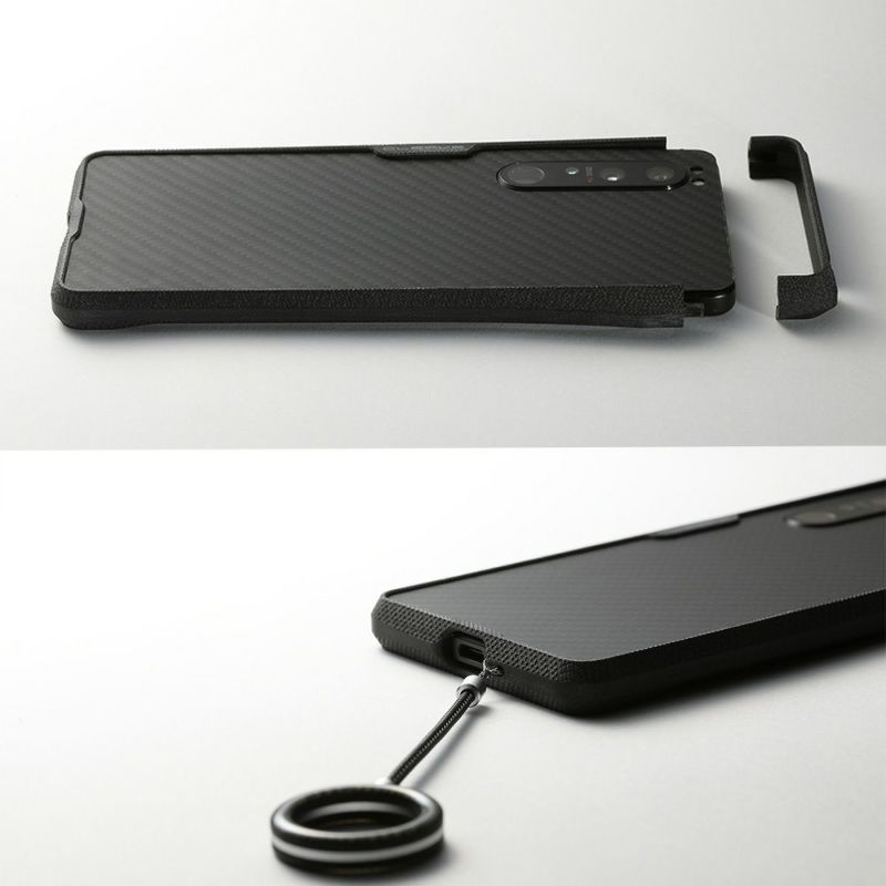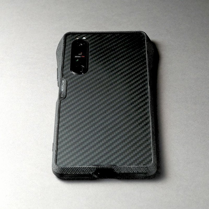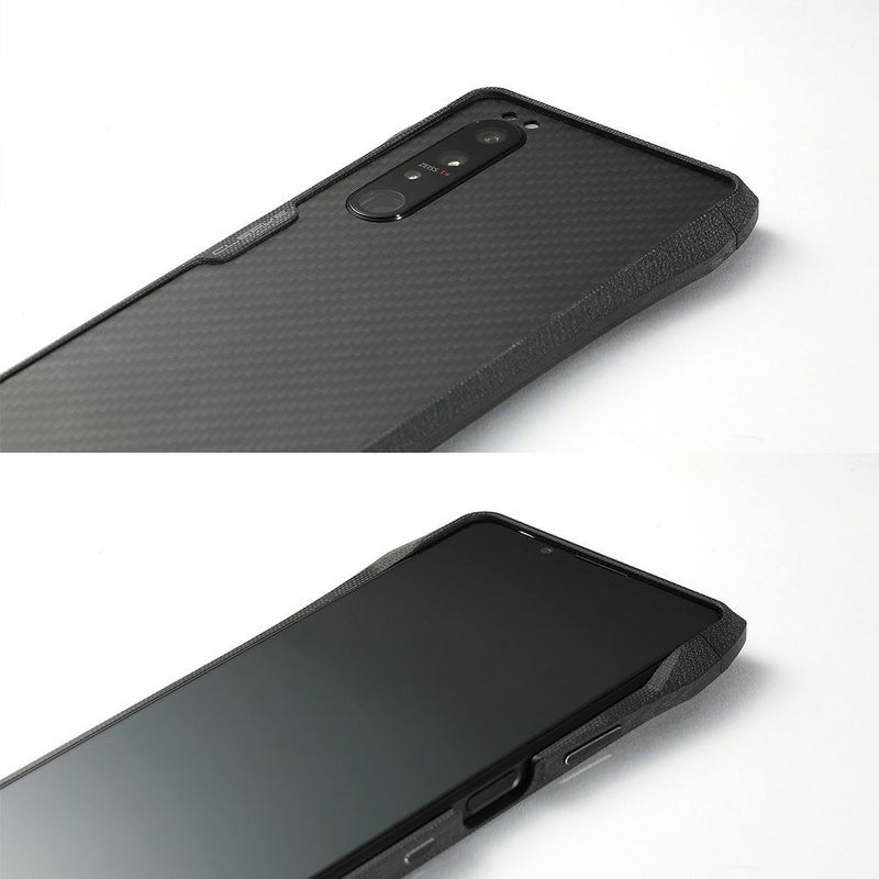 バンパーの縁は液晶面やカメラレンズ面よりも高いため、机上に置いても液晶面やレンズが直接触れません。バンパーの内側四隅には0.3mm厚のシリコーンシートが貼られており、外部からの衝撃をスマートフォンへ直接伝えません。背面には、アラミド繊維製(デュポン社のケブラー(R))のシートを貼り付けることができます。傷つきやすい背面を強固に保護するだけなく、カーボンファイバーを思わせる織目模様は、Xperia 1 IIIをオリジナルにはないソリッドでハードな印象にします。シートは容易に剥がれないよう、バンパーでガードされます。