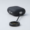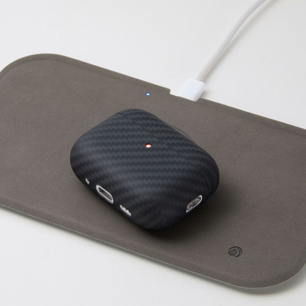 ケースの装着には両面テープや接着材などを一切使用しない完璧なフィット設計です。アラミド繊維は電波を通す素材なので、MagSafe充電器を用いたワイヤレス充電はもちろん、iOSの「探す」アプリにも対応しています。MagSafe充電ケース背面のペアリングスイッチは静電タッチ仕様に変わりましたが、もともと使用頻度が非常に少ないため本モデルではあえて開口処理をしていません。よりスムーズな一体感を実現しました。