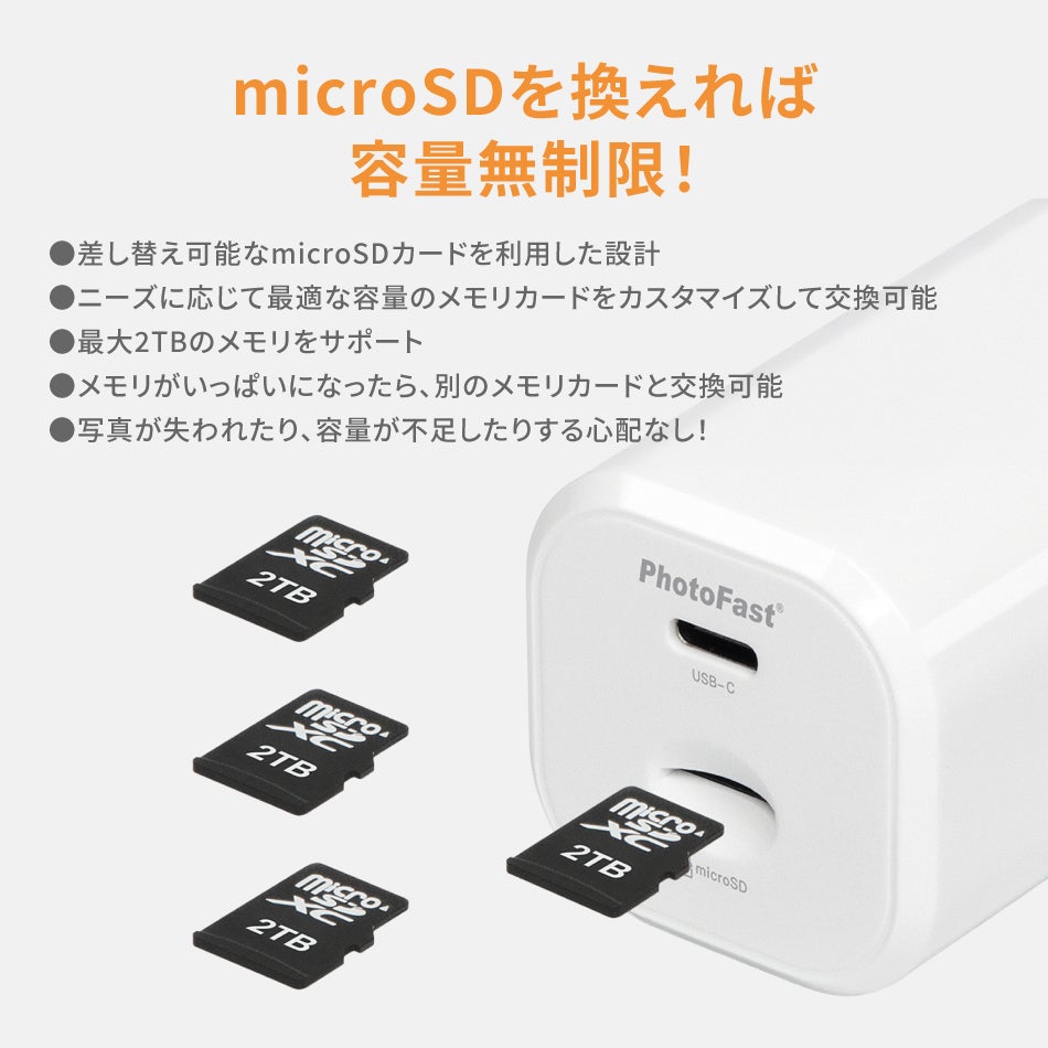 台湾PhotoFast社製の多機能充電アダプター「PhotoPower Plus(PF-PP01)」は、45W PD急速充電・自動バックアップ・microSDカードリーダーの3機能を1台に統合したコンパクトな製品です。コンセントに差し込むだけで充電と同時にバックアップがスタート。寝ている間に写真・動画が自動でmicroSDカードに保存されます。難しい設定は一切不要です。