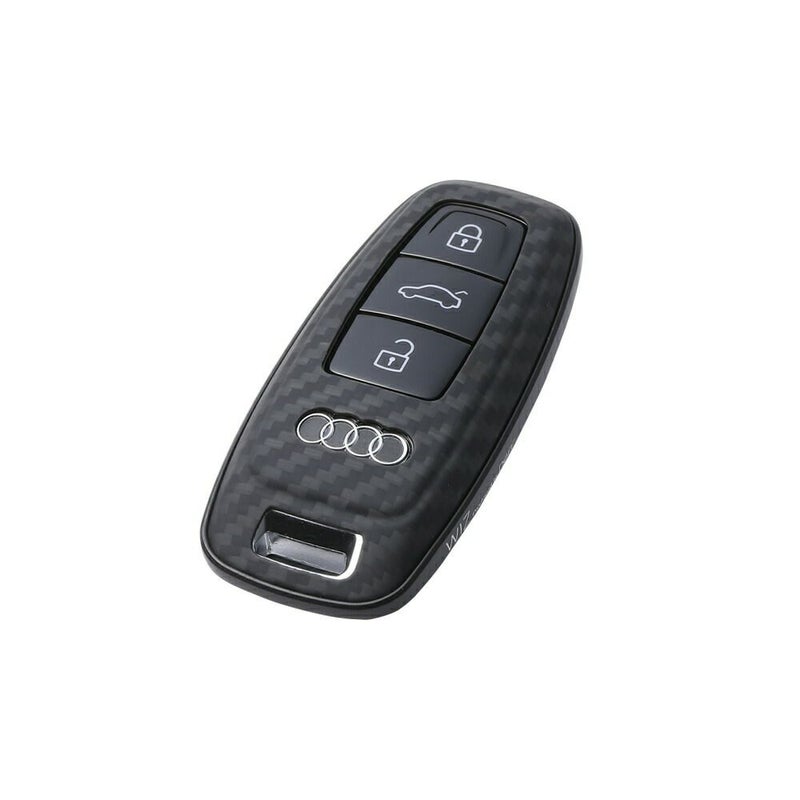 現行Audiの最新モデルに採用されている「Audiアドバンストキー」に対応しています。オリジナルの独特な形状をスポイルすることなく、各部の複雑な形状もアラミド繊維の成形でフィットさせています。外周はアルミニウムを削り出して成形したバンパーでしっかりとガードします。