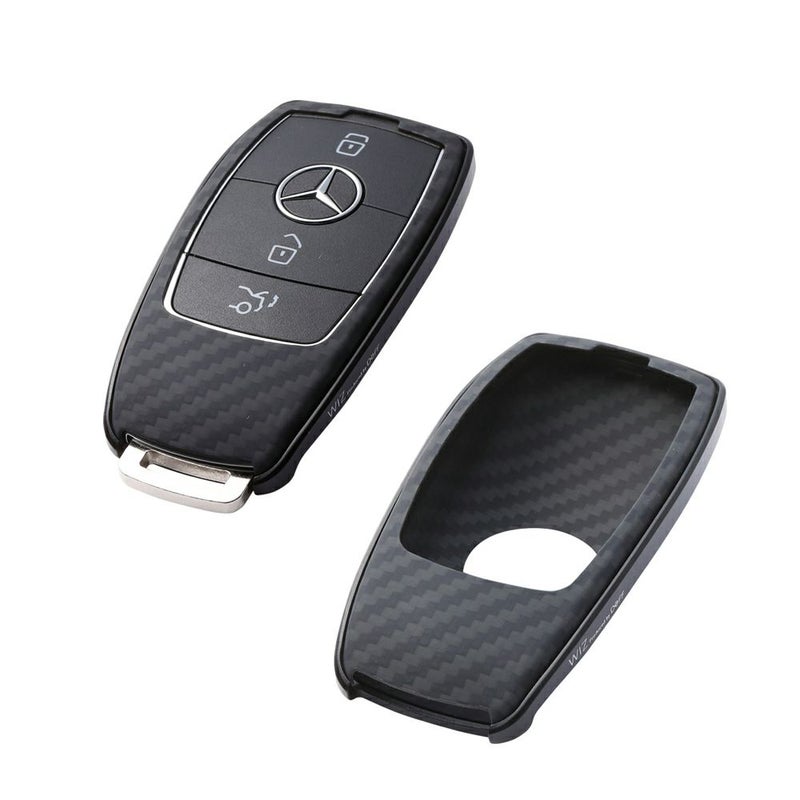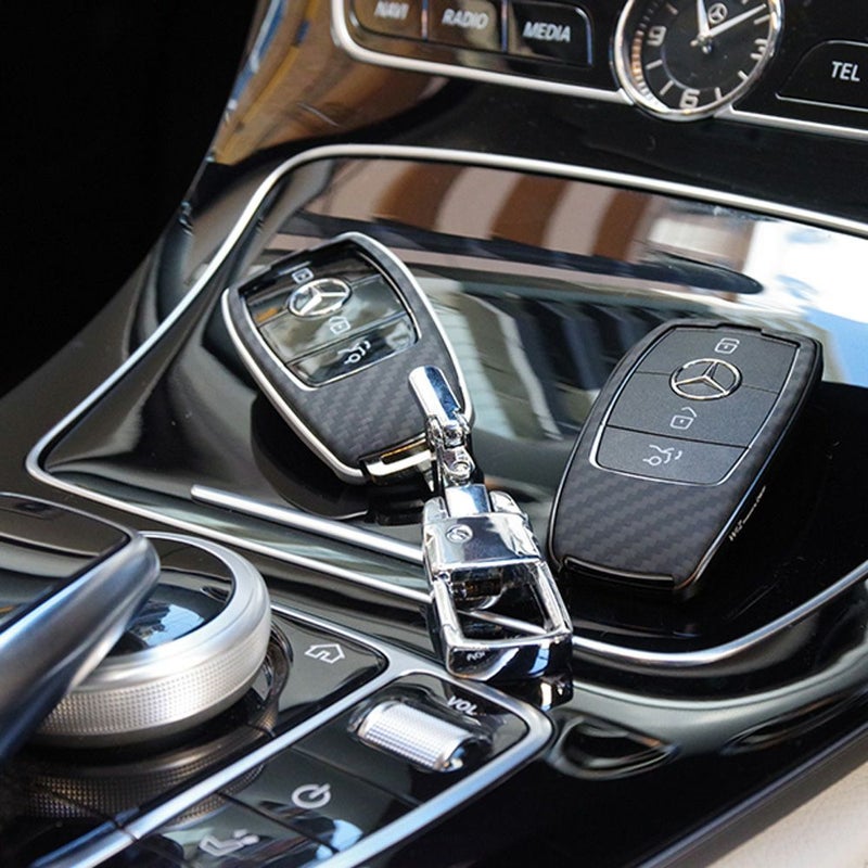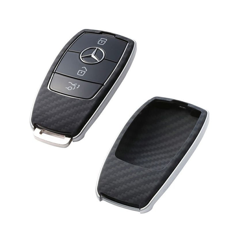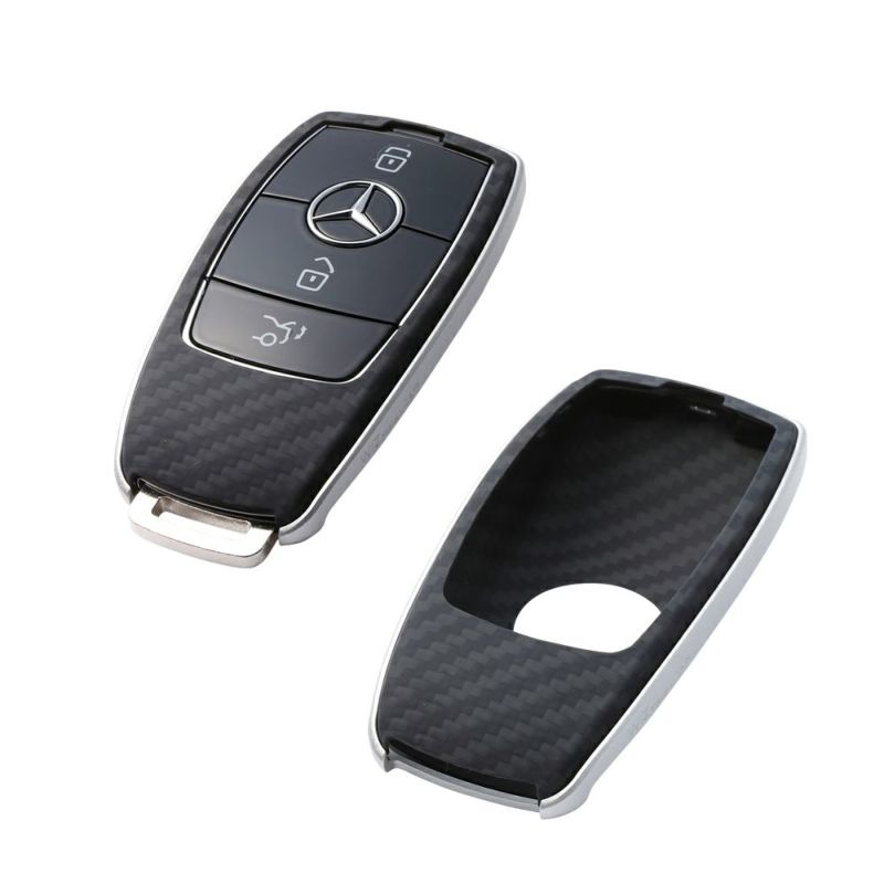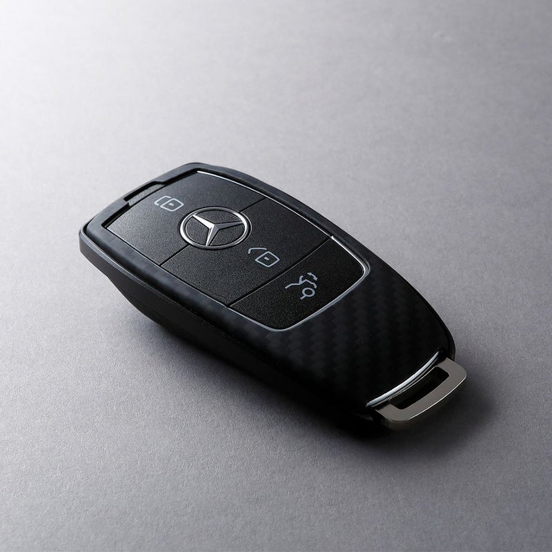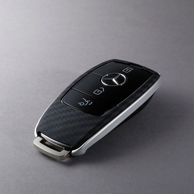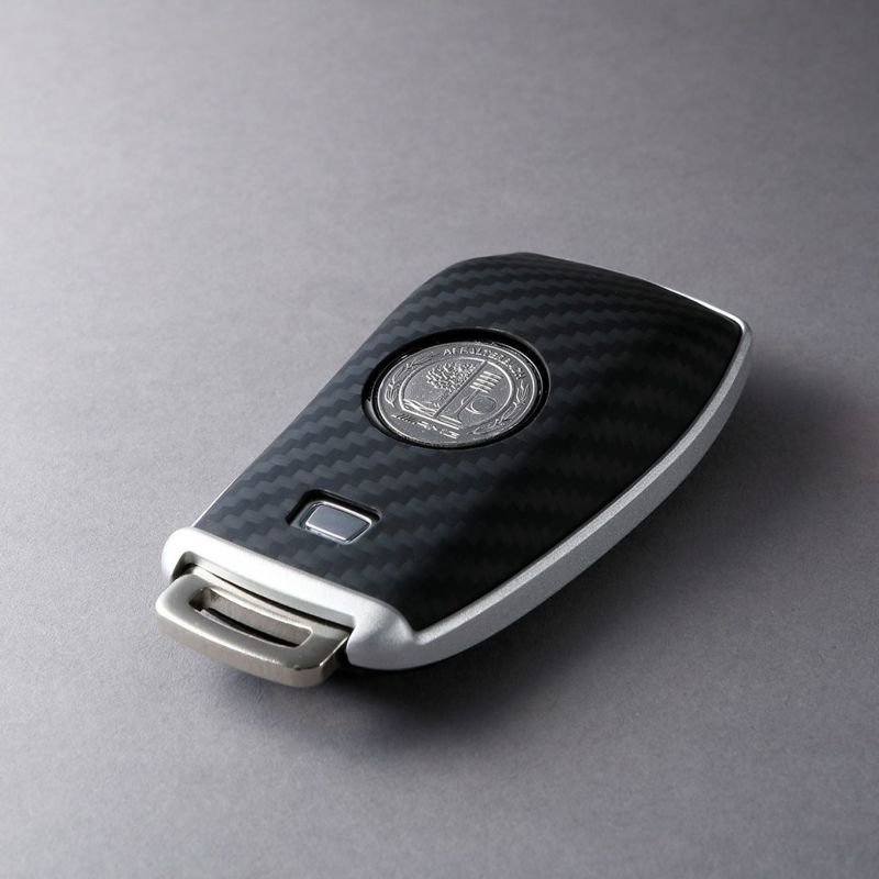 メルセデス・ベンツの最新モデルに採用されている「リモコンキー」に対応しています。オリジナルの独特な形状をスポイルすることなく、各部の複雑な形状もアラミド繊維の成形でフィットさせています。また、AMGシリーズ向けに背面のメダリオンが露出する仕様も別途ラインナップしました。外周はアルミニウムを削り出して成形したバンパーでしっかりとガードします。