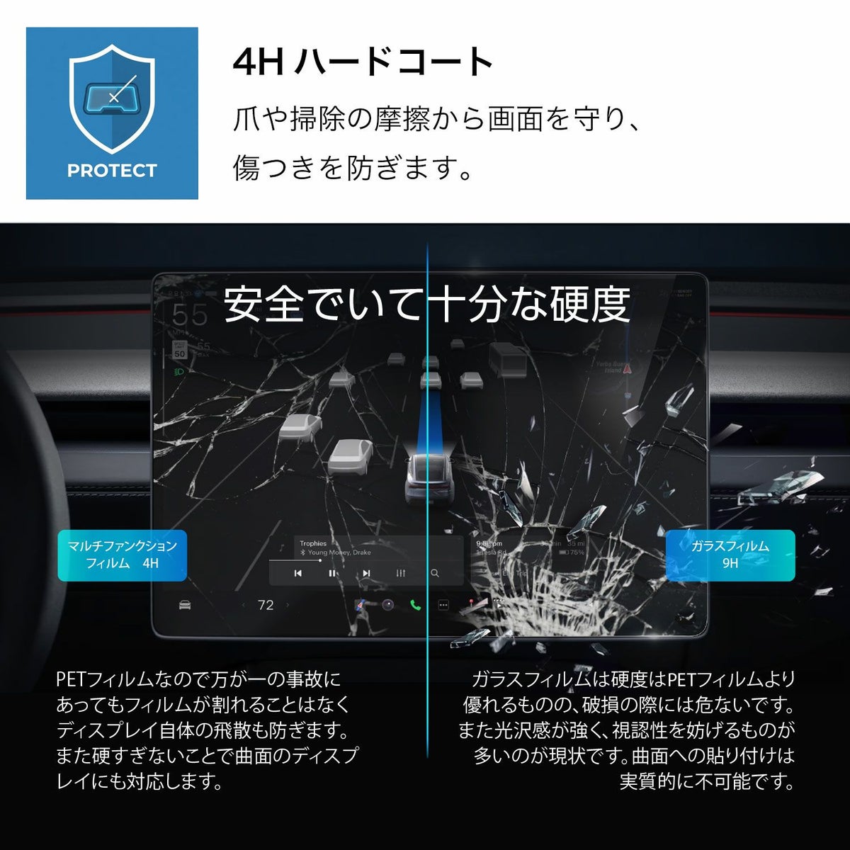 日差しの強い車内環境でも、画面をくっきり見やすく、そして清潔に保つために。Deffが独自開発した多機能フィルムを採用しています。