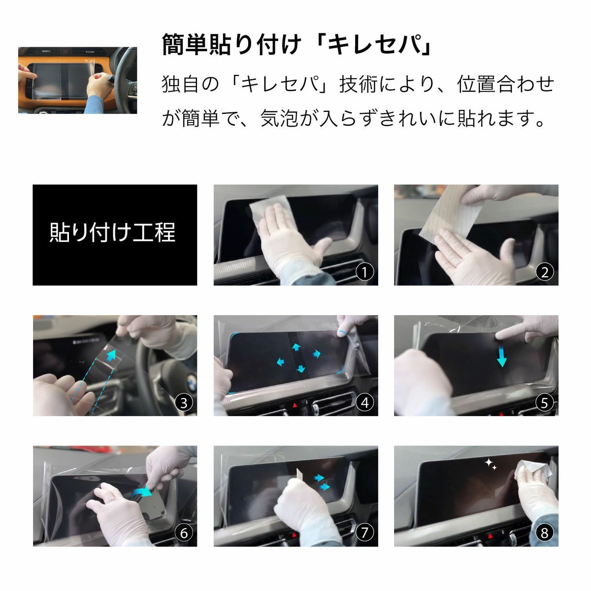 信頼性の高い日本国内工場で製造。大型のナビ画面でも気泡やホコリが入りにくいよう、剥離フィルムが分割された独自構造「キレセパ」を採用しました。