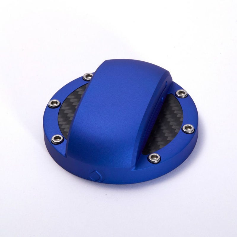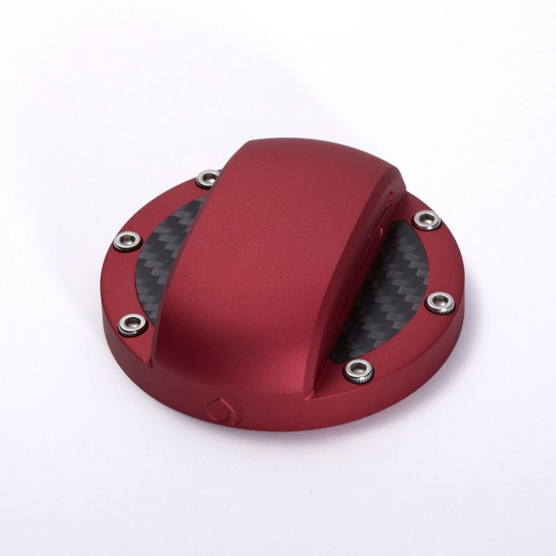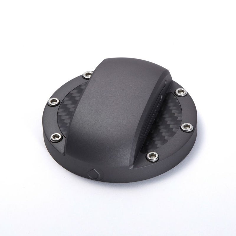 オリジナルのフューエルキャップのディテールは残しつつ、ディーフのデザイン解釈で再デザインをしました。キレのある適度なエッジとスムーズなラウンドで構成されたシンプルな形状です。無駄な文字やアイコンはあえて入れず、部品としての存在感を高めています。キャップ部のパネルにはドライカーボンパーツをはめ込み、上質な質感と軽快感を加えました。
