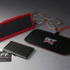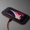 カーボンファイバーの織目を立体的な型押しで再現したリアルな触感・質感のPUレザーを表皮に、中央にはGT-Rのエンブレムを美しくプリントしています。充電器の形状は角が丸くて薄いトレー状。裏面は滑りにくい素材なので安定して設置できます。