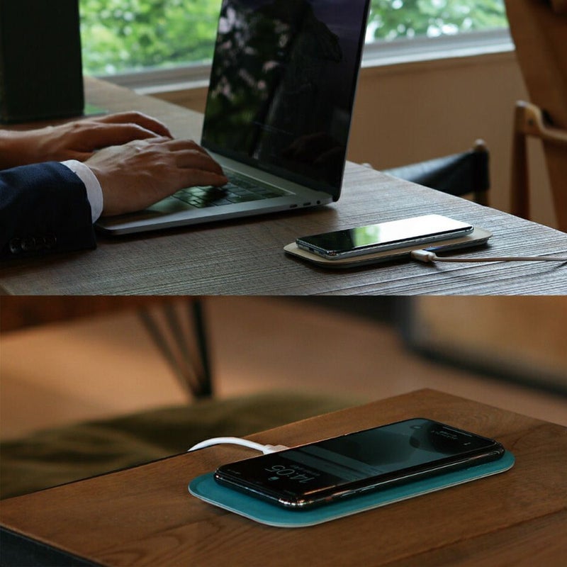 WIZワイヤレス充電トレイは縦長のトレイなため、それに合わせてスマホを置くようになります。すると自然と充電のための内蔵コイルがスマホ側のコイルが近くになり、充電が始まります。一般的な丸型ワイヤレス充電器の場合、スマホが充電されるよう位置を合わせながら置かなければならないものもありますが、その手間がありません。またトレイの端が軽く跳ね上がっています。丸型のワイヤレス充電器では不意にスマホがズレてしまい、充電されていなかったということもありますが、WIZワイヤレス充電トレイならその心配もありません。