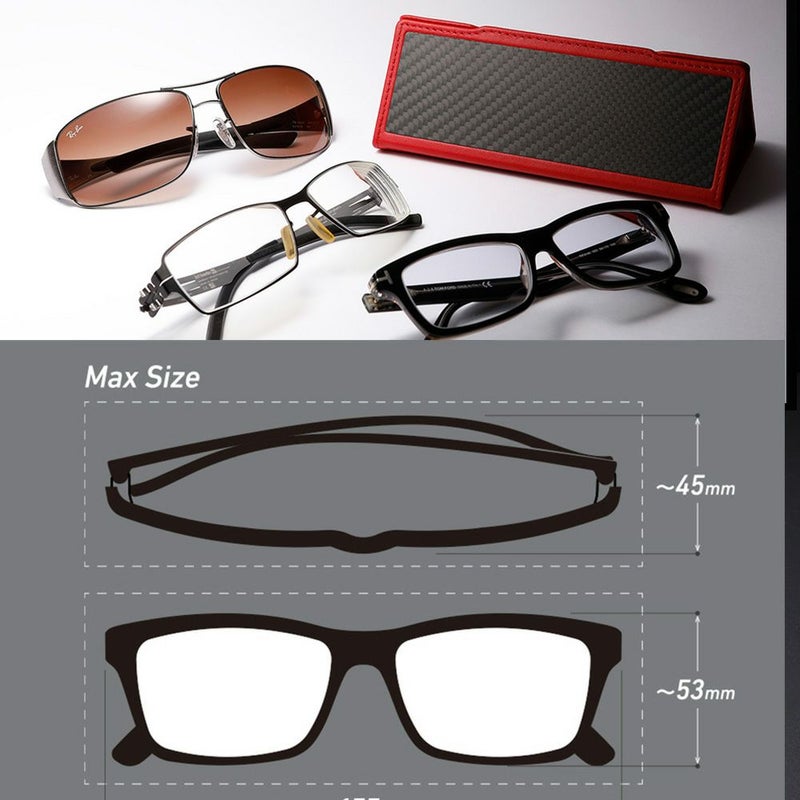 折りたたみ時のサイズは幅167×奥行69×厚み9mmなので、カバンやスーツの内ポケットにさっとすっきり収まります。展開時は最大約155×52mmのメガネまで収納可能。一般的なメガネ・サングラスであれば収納可能です(※2)。ケースの内側には、上質なマイクロファイバーを全面に貼り付けており、大事なメガネ、サングラスをやさしく保護します。カラーはブラックとレッドの2色です。
