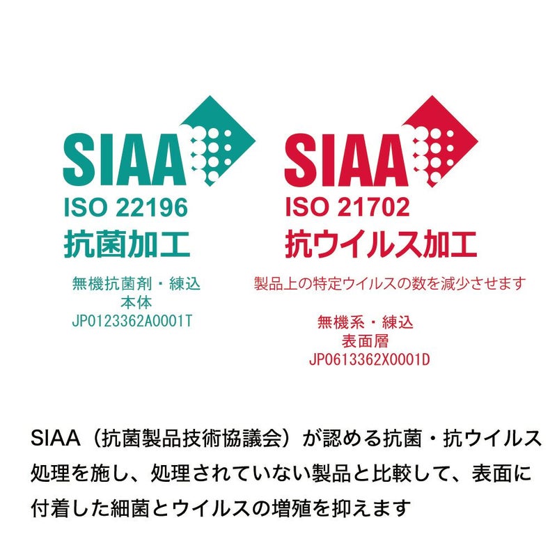 さらに、SIAA(抗菌製品技術協議会)が認める抗菌・抗ウイルス処理を施し、処理されていない製品と比較して、表面に付着した細菌とウイルスの増殖を抑えます。
