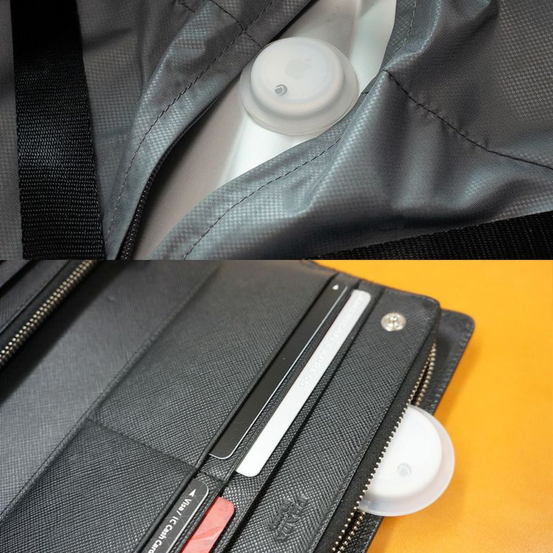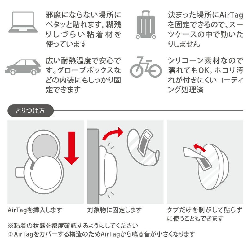 AirTagをPCやスーツケースの内部など固定しにくい部分にも取り付けられるケースです。ケースはポケット構造なので必要に応じて脱着ができます。内部にはAirTagの形状にあわせた溝があり、容易に飛び出さないようになっています。