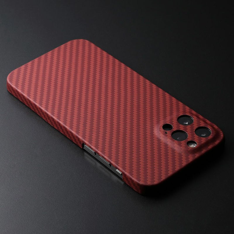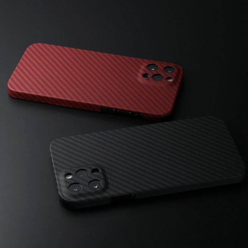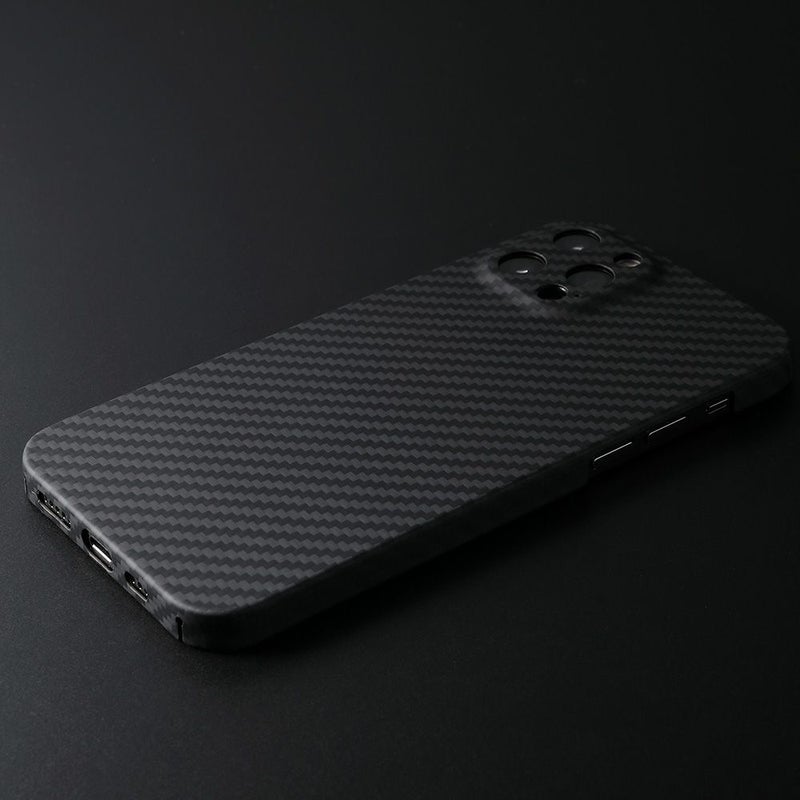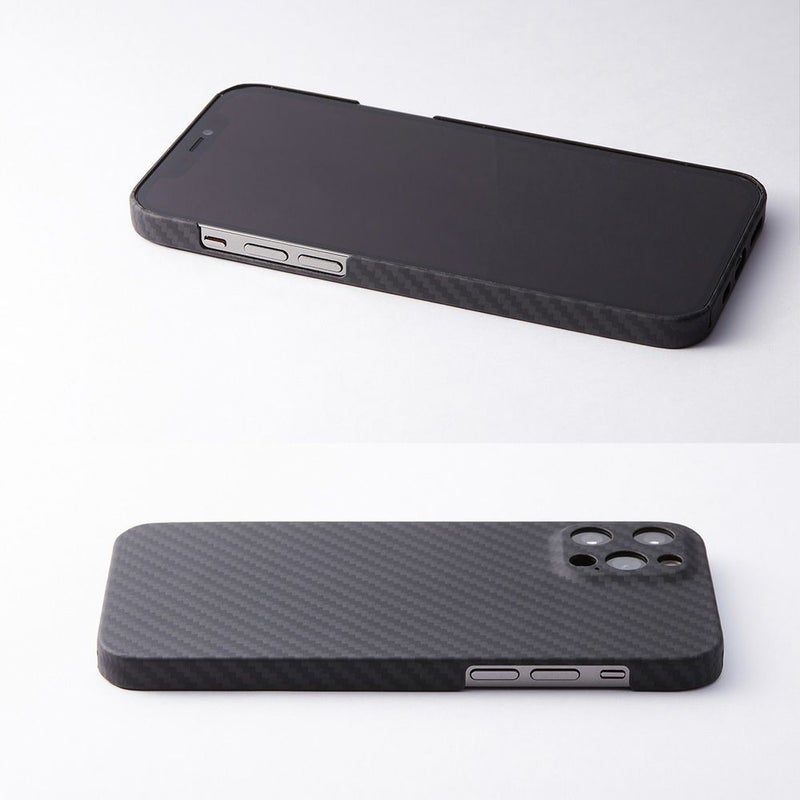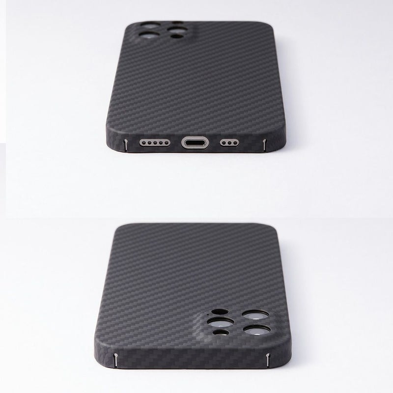 ディーフではアラミド繊維の取扱いに長けたパートナーと共に、理想のケースを求めて追求し続けてきました。その結果、素材の特性を十分に活かしたケースの製品化に成功しました。成形が難しい広い面積ですが、PC材などのフレームを一切使わずに全てをアラミド繊維だけで成形されているのも特徴です。ダメージの多いカメラ周りも全て囲っていますので、安心してお使い頂けます。