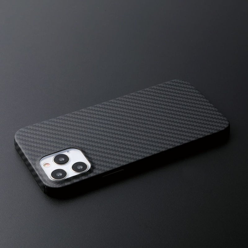 外周すべてを保護する精密成型と、スピーカーホール周りをくり貫く微細加工が施されており、アラミド繊維の特徴を活かした「DURO」は軽量かつ強靭。マット仕上げで、特殊コーティングにより滑らかで手にしっとり馴染む肌触りも実現しています。また、アラミド繊維の織り目を活かしつつ、iPhoneそれ自体の機能美溢れる美しさを際立たせるシンプルで美しい仕上がりになっています。大きなiPhoneでも持ちやすいようにストラップを取り付けることも可能です。もちろん、装着していても通話やモバイルSuicaの使用に影響はありません。