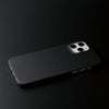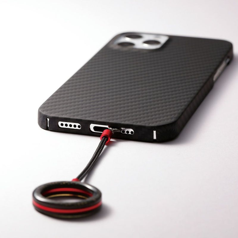 外周すべてを保護する精密成型と、スピーカーホール周りをくり貫く微細加工が施されており、アラミド繊維の特徴を活かした「DURO」は軽量かつ強靭。マット仕上げで、特殊コーティングにより滑らかで手にしっとり馴染む肌触りも実現しています。また、アラミド繊維の織り目を活かしつつ、iPhoneそれ自体の機能美溢れる美しさを際立たせるシンプルで美しい仕上がりになっています。大きなiPhoneでも持ちやすいようにストラップを取り付けることも可能です。もちろん、装着していても通話やモバイルSuicaの使用に影響はありません。