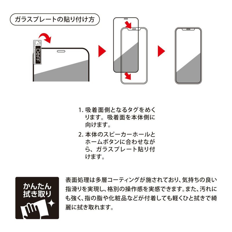 表面処理は多層コーティングが施されており、気持ちの良い指滑りを実現しました。格別の操作感を実感できます。また、汚れにも強く、指の脂や化粧品などが付着しても軽くひと拭きで綺麗に拭き取れます。万が一割れても、破片が飛散したり指に刺さることのないよう、特殊なフィルムで飛散防止処理が施されています。