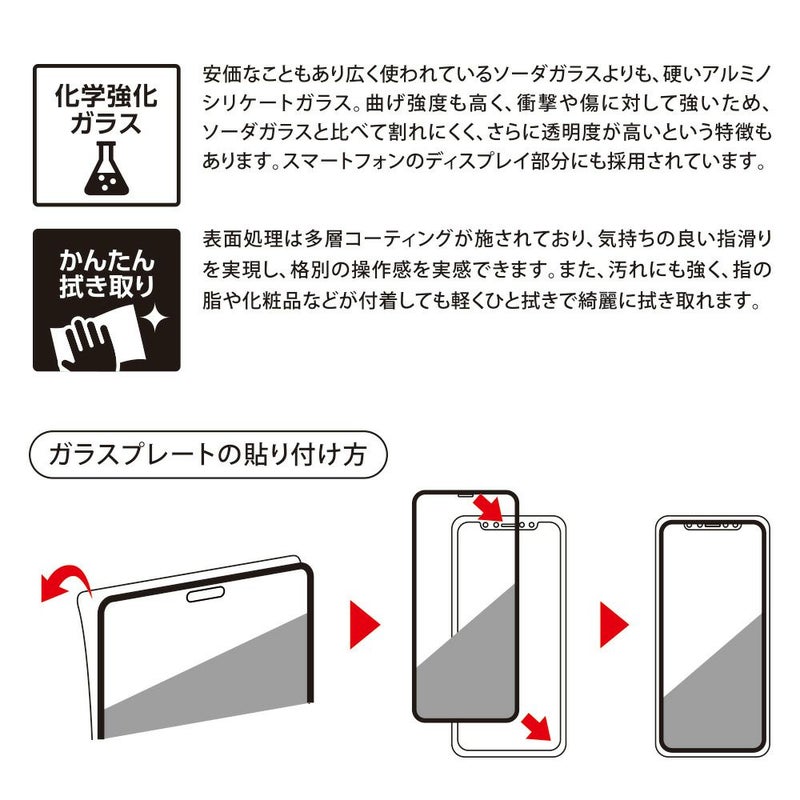 「TOUGH GLASS 3D」で使われている二次硬化ガラスは、一般的な熱強化処理を行った後に、特殊な薬品を使った硬化処理を行っています。2度の硬化処理により、側面・端面を含む全方位の硬化を実現。さらにガラスの強度自体も大きく向上。一般的なガラスでありながら、二次硬化処理により強度を誇る化学強化ガラスに匹敵する高強度になっています。表面処理として多層コーティングも施されており、指の滑りも快適に操作できるだけでなく、汚れにも強く皮脂や化粧品などが付着しても、軽く拭き取ることが可能です。