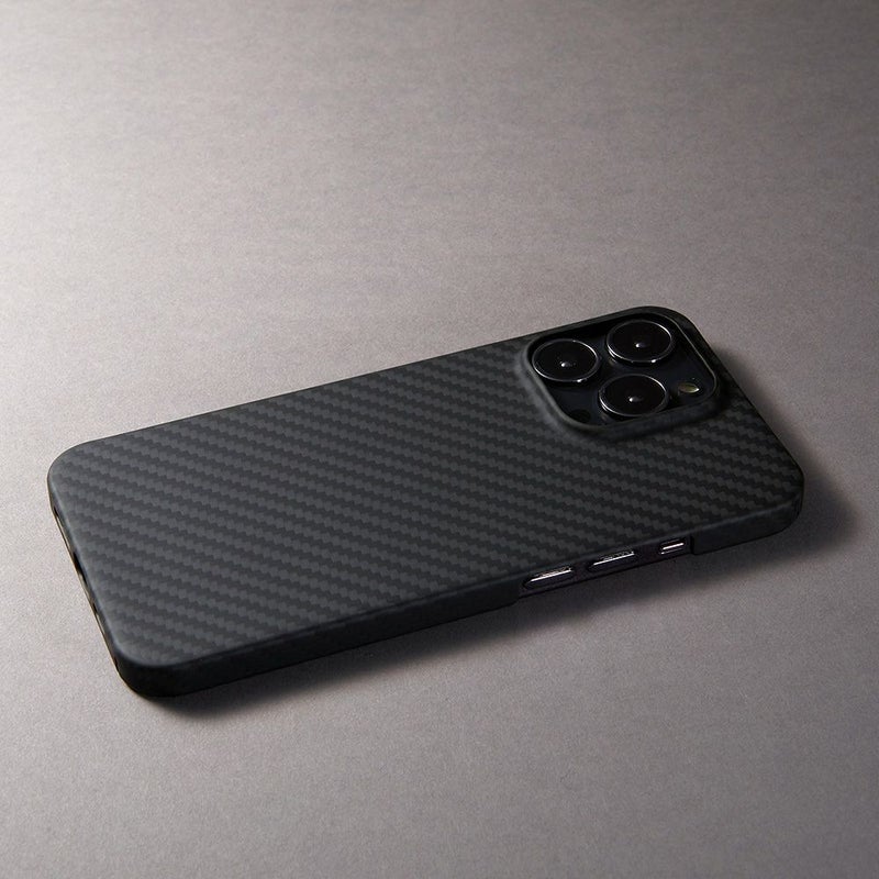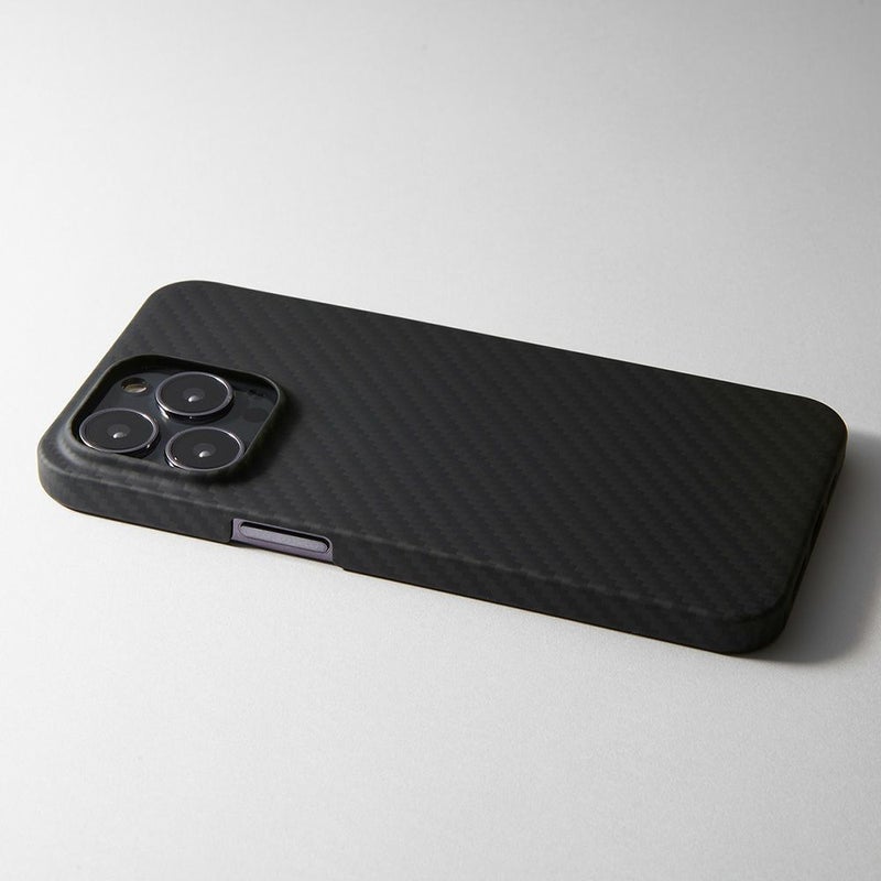 同質量の鋼鉄よりも5倍強く、ガラス繊維の半分の軽さという「アラミド繊維」。その中でも世界トップブランドの米国デュポン社製 ケブラー(R)を贅沢に使った特別なケースです。iPhoneのディテイルとほぼ同じ形状を踏襲し、装着しても本体がケース太りしません。装着していることすら忘れる約0.6mmの薄さとiPhone 13で約11gという軽さを誇ります。