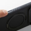 PC(ポリカーボネート)とTPU(熱可塑性ポリウレタンエラストマー)で構成されたケースの背面に薄型のリングを内蔵しました。リングはフィンガーリング、スタンド、MagSafeリングとして使うことができます。リングのベース部は360度自由に回転できるギア+ラッチ構造で、回す際にはカチカチとクリック感があります。リング本体も無段階で120度まで起こせますので、フィンガーリングやスタンドとして活用できます。