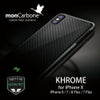 背面部分に、折り目が美しく引き立つようデザインされたデュポン社の強化繊維「ケブラー?」を使用した「monCarbone KHROME」シリーズ。「レース」にインスパイアされた本シリーズは素材を使い分けることで、お求めやすい価格になっています。カラーはツヤありのミッドナイトブラックとマットのステルスブラックの2種類。背面下部にあるアイコン部分には蓄光シールが裏面から貼られています。ぼんやり光るため、暗がりでもiPhoneをすぐに見つけることが可能です。