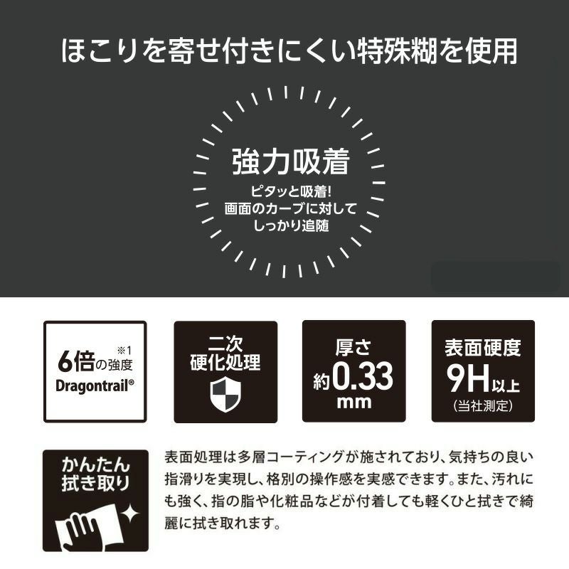 表面処理は多層コーティングが施されており、気持ちの良い指滑りを実現しました。格別の操作感を実感できます。また、汚れにも強く、指の脂や化粧品などが付着しても軽くひと拭きで綺麗に拭き取れます。万が一割れても、破片が飛散したり指に刺さることのないよう、特殊なフィルムで飛散防止処理が施されています。