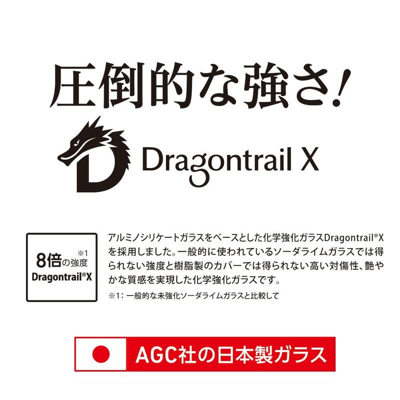 Dragontrail™ Xは、ソーダライムガラスと比較し約8倍、従来のDragontrail™ と比較しても約30%上回る世界最高レベルの強度を持つガラスです。