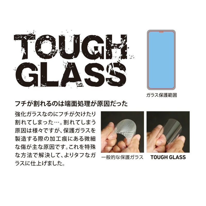 「TOUGH GLASS 3D」で使われている二次硬化ガラスは、一般的な熱強化処理を行った後に、特殊な薬品を使った硬化処理を行っています。2度の硬化処理により、側面・端面を含む全方位の硬化を実現。さらにガラスの強度自体も大きく向上。一般的なガラスでありながら、二次硬化処理により強度を誇る化学強化ガラスに匹敵する高強度になっています。表面処理として多層コーティングも施されており、指の滑りも快適に操作できるだけでなく、汚れにも強く皮脂や化粧品などが付着しても、軽く拭き取ることが可能です。