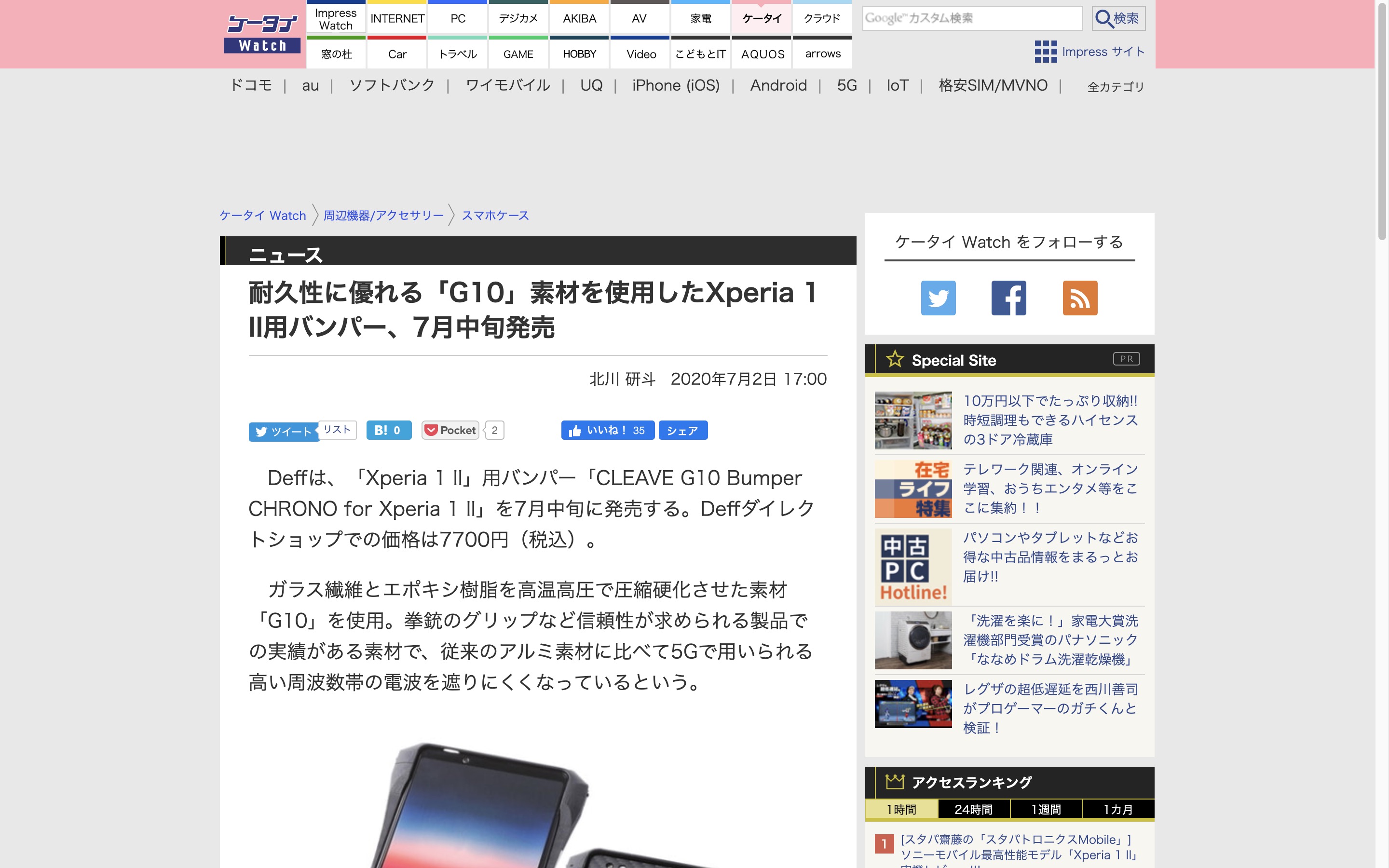 ケータイWatchの記事『耐久性に優れる「G10」素材を使用したXperia 1 II用バンパー、7月中旬発売』で「CLEAVE G10 Bumper CHRONO for Xperia 1 II」が紹介されました。