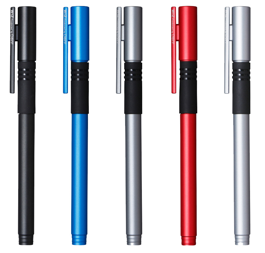 素材はアルマイト処理済みのアルミ製。肌触りの良さと高級感を両立しています。カラーはブラック、ブルー、グラファイト、シルバー、レッドの5色をご用意。ペンのカラーに合わせて「WIZ PEN JACKET」も使い分けることができます。