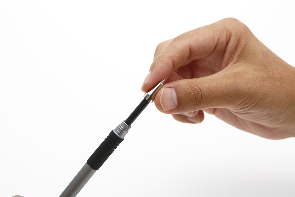 別途、購入した「ユニボール シグノ 極細」シリーズから口金とリフィルを取り出して「WIZ PEN JACKET」に挿し込み、回して固定するだけで装着できます。作業は簡単、特別な工具は不要です。0.28mm、0.38mm、0.5mmのペンに対応しています。