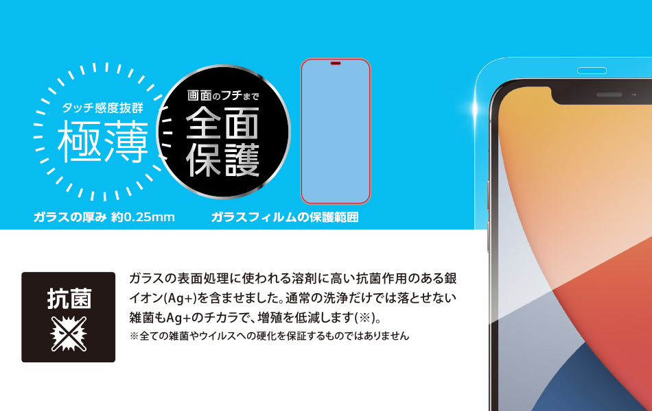 さまざまな場所で使われるスマートフォン。最も触れる機会が多いカバーガラス部分を抗菌処理することで、安心感を高めています。