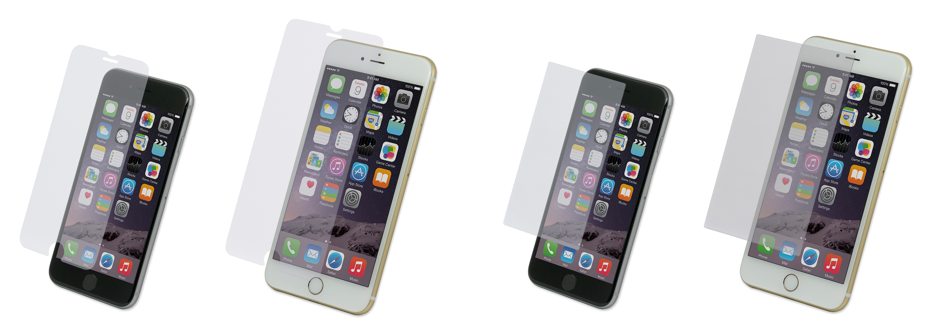 ※左からiPhone 6用0.2/0.33mm厚。iPhone 6 Plus用0.2/0.33mm厚。iPhone 6用ブルーライトカット。iPhone 6 Plus用ブルーライトカット