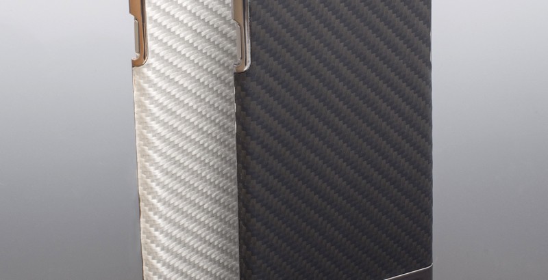 カーボンファイバーと天然レザーを使用したiPhone 6用のフリップタイプケース。縫い目のないシンプルなフォルムと、全周囲を囲う完全カバーでiPhoneを保護