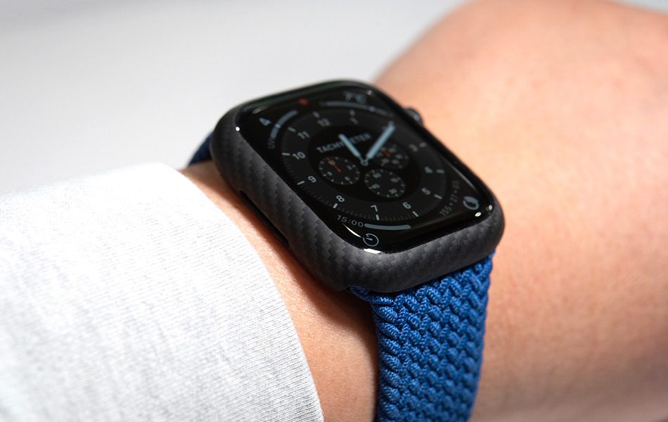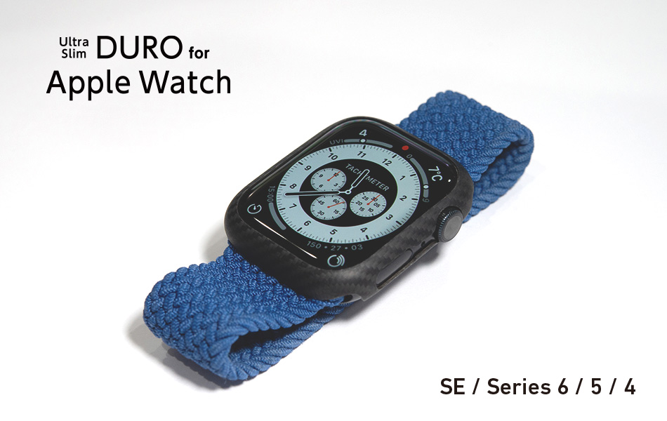 Apple Watch Series 4〜6、SEに対応したDURO。本体にフィットして自然な装着感を実現。セルラー機能に影響しない高品位アラミド繊維を採用。重量は1円玉よりも軽い0.6g(40mm)