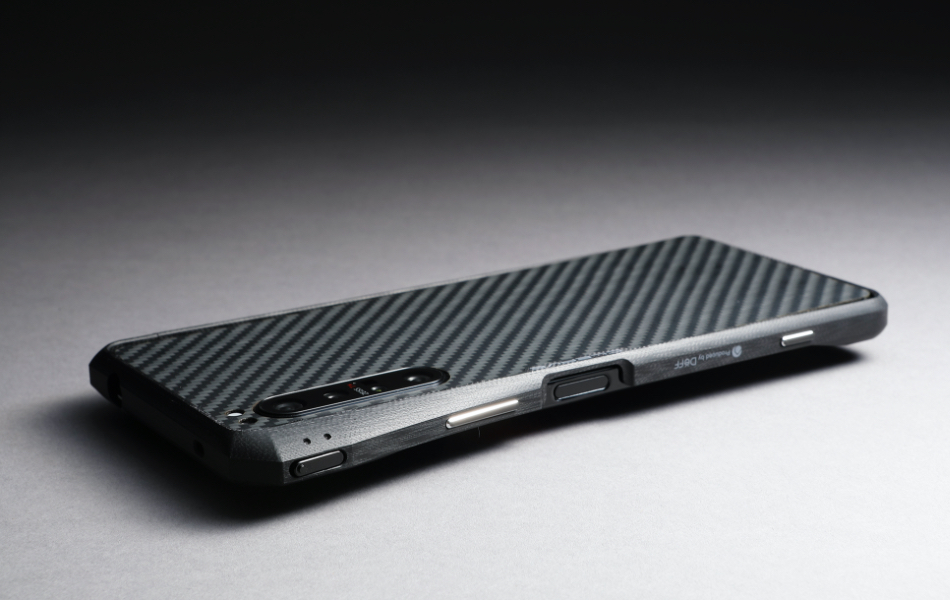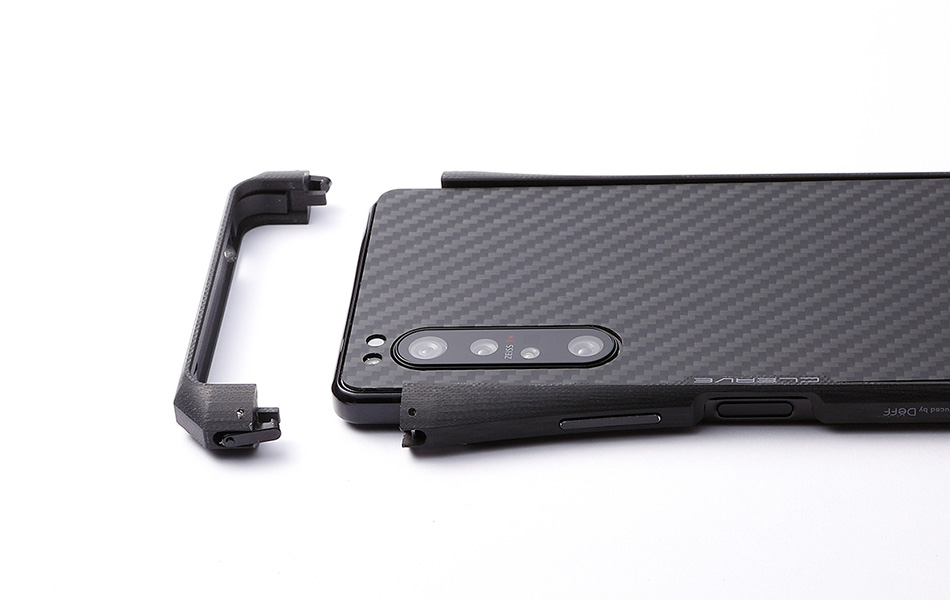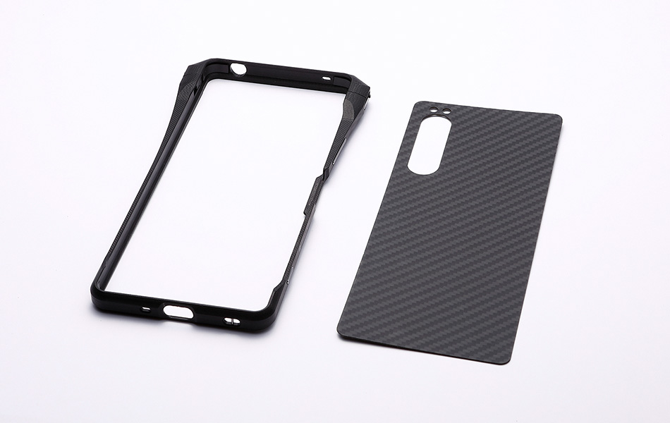 本製品はあえて表面の塗装や研磨処理をせずに仕上げてあります。G10ならではの独特なサラッとした触り心地と、手に吸い付きしっかり持てる感触は安心感を与えてくれます。また、背面全体を保護するアラミド繊維(デュポン製ケブラー)を使用したプレートも付属。好みに合わせて背面に貼ることで、背面をよりハードなイメージにするだけでなく、すり傷などからXperia 1 IIの背面ガラスを保護します。NFCやワイヤレスチャージにも影響しません。