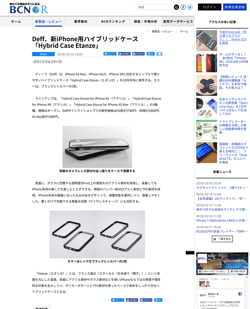BCN+Rの記事『Deff、新iPhone用ハイブリッドケース「Hybrid Case Etanze」』で、「Hybrid Case Etanze for iPhone XS / XR / XS Max(アクリルジャケットタイプ)」が紹介されました。