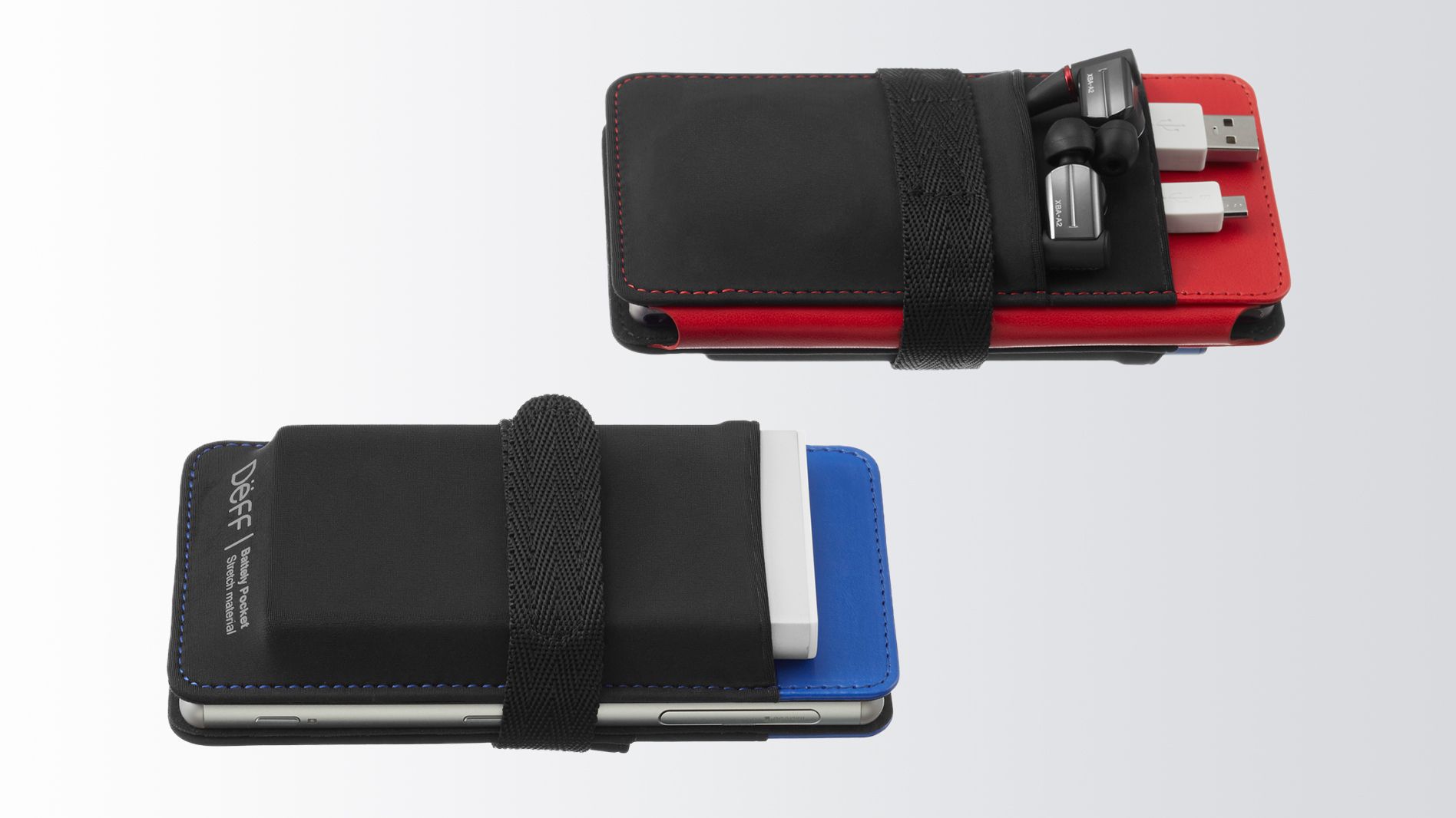 Deffが得意とするフリップタイプケースをモチーフに、頻繁に持ち歩く事となるUSBポータブル電源、USBケーブル、イヤホンとスマートフォンを1つにまとめて収納できる便利なケースです。ケースには3つのポケットがあり、それぞれにお好みの物を入れられます。ポケットの生地は収縮性のあるストレッチ素材なので、内容物に合わせてフィットします。