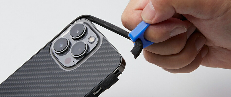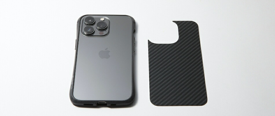 またiPhone 13 Pro用のみ、背面用のアラミド繊維製(デュポン社のケブラー)のシートが付属。シートは傷付きやすい背面を強固に保護するだけなく、カーボンファイバーを思わせる織目模様がオリジナルにはないソリッドでハードな印象へ変化させます。