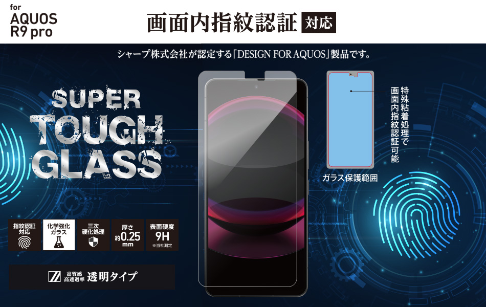 SUPER TOUGH GLASS for AQUOS R9 proは、画面内超音波指紋認証でのワンタッチ登録と認証の両方に対応した ガラス製スクリーンプロテクターです。全面シリコーン糊仕様なので貼った後でも美しい表示はそのまま。貼る前と同じ感覚で指紋認証機能が使用できます。端面のラウンドエッジ加工による指触りの良さに、汚れが付きにくく簡単に拭き取れる特殊表面処理で普段の使い心地を格段にアップします。