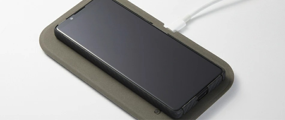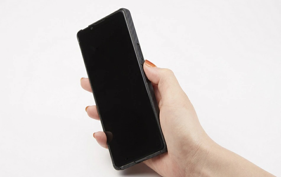 表面には複数のコーティング処理が施されており、防汚処理で汚れが付きにくく、汚れが付いても簡単に拭き取れます。カーボンファイバーを思わせる美しい織目が高級感を感じさせます。4G、5Gを含むすべてのデータ通信、通話、NFC通信、モバイルSuica、ワイヤレス充電などへの影響はありません。