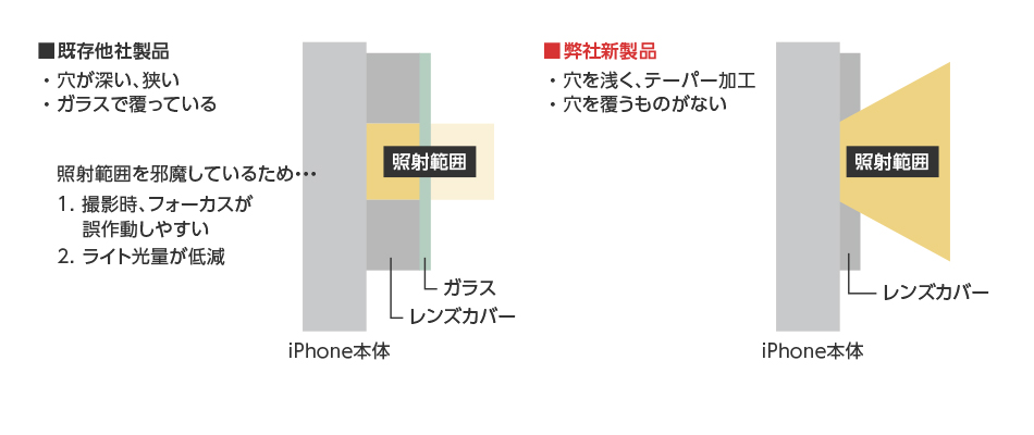 フラッシュライトとLiDARセンサー(Proシリーズのみ)は、ガラスでカバーをしたり、カバーの穴を深くすると誤動作の原因になります。本製品ではセンサー部はカバーがない開口処理とし、さらに開口部分をテーパー加工にすることで、フラッシュ使用時の光量減少を回避しました。また、Proモデルにのみ搭載されているLiDARセンサー穴は、センサー稼働時のカメラのレンズ選択とオートフォーカスの誤動作を発生させないように配慮しています。これらの加工はApple社の資料を元に設計されています。