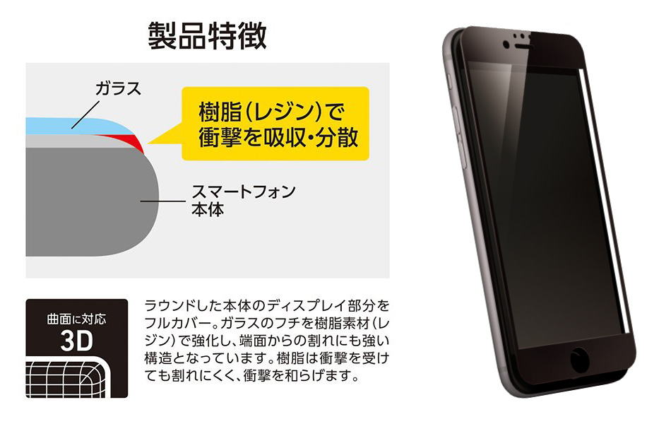 「TOUGH GLASS 3D」で使われている二次硬化ガラスは、一般的な熱強化処理を行った後に、特殊な薬品を使った硬化処理を行っています。2度の硬化処理により、側面・端面を含む全方位の硬化を実現。さらにガラスの強度自体も大きく向上。一般的なガラスでありながら、二次硬化処理により強度を誇る化学強化ガラスに匹敵する高強度になっています。表面処理として多層コーティングも施されており、指の滑りも快適に操作できるだけでなく、汚れにも強く皮脂や化粧品などが付着しても、軽く拭き取ることが可能です。