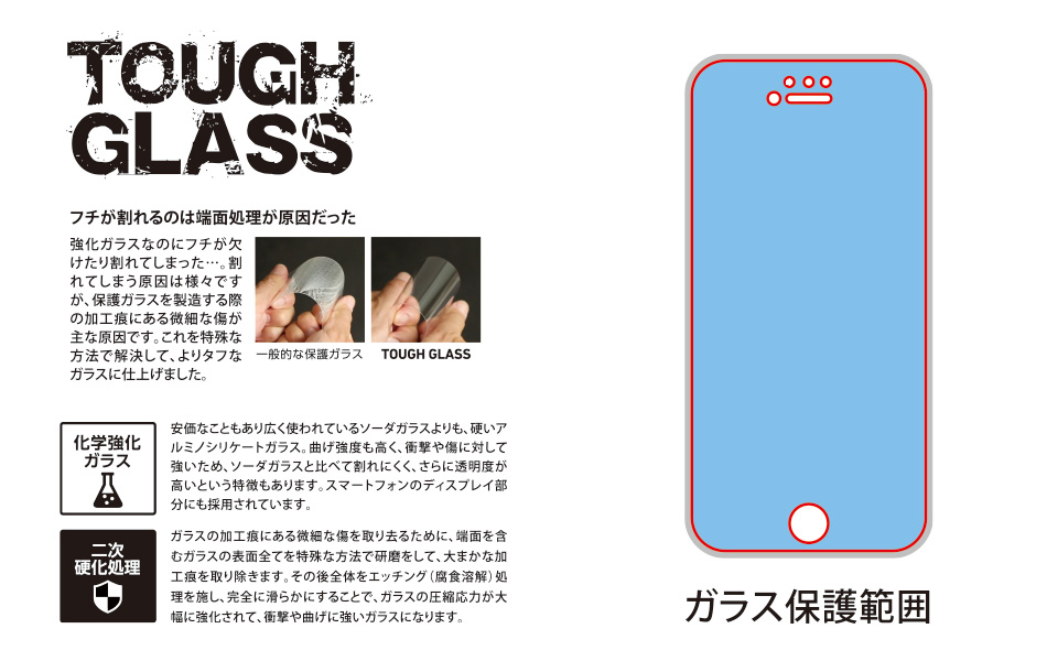 丈夫で長く使えることで定評のある「TOUGH GLASS 3D」は、独自開発した二次硬化ガラスを使用したディスプレイ保護ガラスプレートのシリーズです。一般的にガラスは、熱を加えてから急激に冷やす硬化処理法で強度を高めていますが、この方法では側面・端面まで十分に強化できず、金属などで衝撃が加わると「欠け」が生じてしまいやすいという特徴があります。しかも、この「欠け」は、一定の深さにまで達することで、ガラス自体が割れてしまう原因にもなっています。