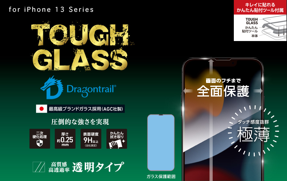 ディーフ株式会社(社長:荒木 徹、本社:東京都港区)は、Apple社製最新スマートフォン、iPhone 13シリーズ用のディスプレイ保護ガラスプレート「TOUGH GLASS」、側面にバンパーを設けた「BUMPER GLASS」、国産「Dragontrail X」の原板をそのまま使った超耐久保護ガラス「ULTRA HARD GLASS」、スタンダードな「High Grade Glass Screen Protector」を9月下旬に発売いたします。