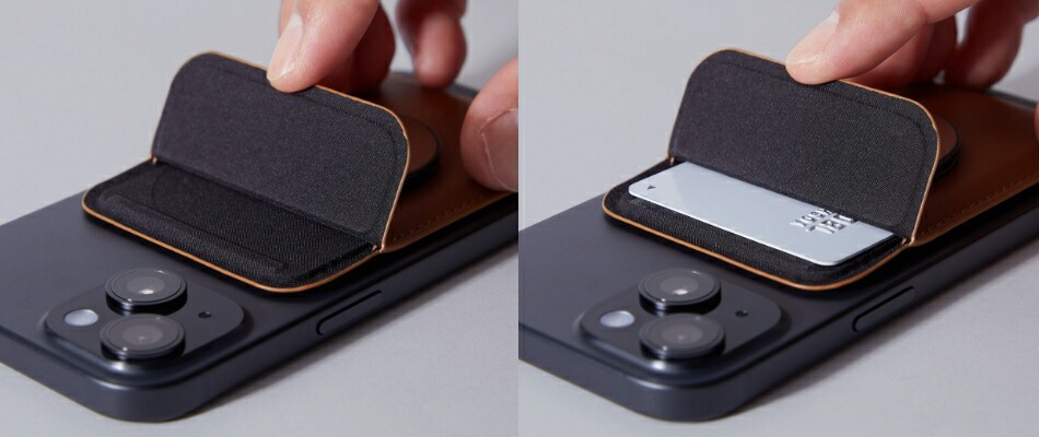 ポケットにはクレジットカードサイズで約2枚。それよりも薄い名刺やポイントカードならば、もう1〜2枚収納できます。折りたたんだ紙幣やレシートを入れるポケットとしても便利です。フリップが装備されているので、ポケットを逆さにしても中身が飛び出しません。フリップは前開きで中身の出し入れがしやすくなっています。