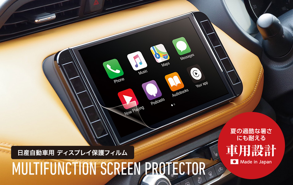 商品は薄いながらもコシのあるPET素材をベースに、特殊シリコーンを組み合わせて曲面でもピッタリと貼れるものにしました。フィルムを貼った際の空気抜けも良く、何度も貼り直せます。ディスプレイにネバネバとした糊が残ることも一切ないため、自動車を売却する際にも安心です。使われている素材は耐熱仕様(-25〜85度)なので、夏の暑さにも耐え安心して使うことができます。